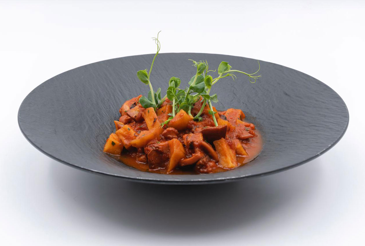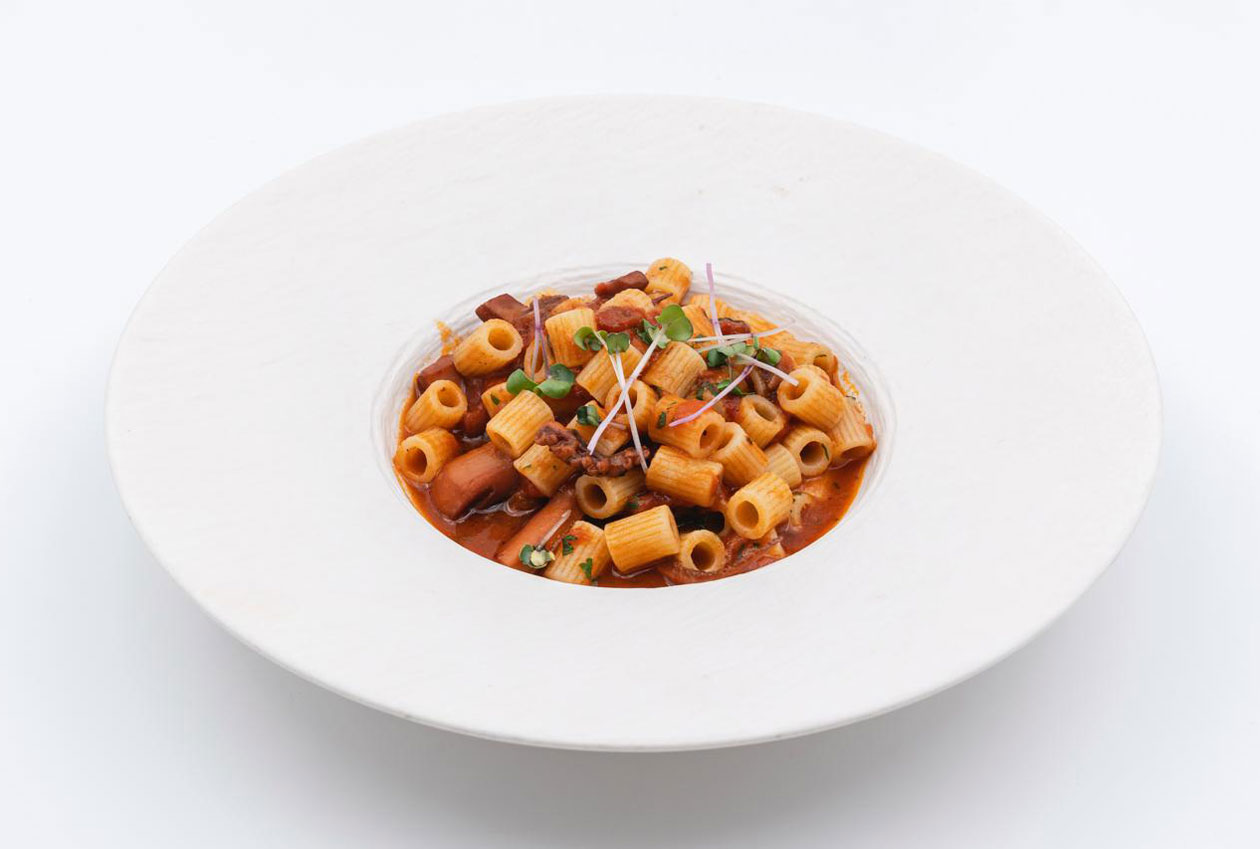Ndunderi di Minori con salsa ai pomodorini del Vesuvio, provola e rucola selvatica Minori’s Ndunderi pasta with Vesuvio cherry tomatoes sauce, provola cheese, and fresh arugula