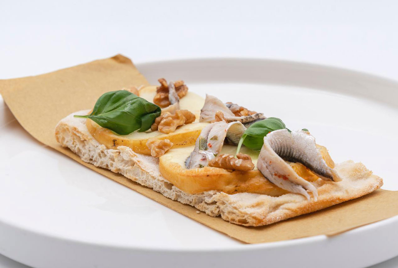 Bruschettone with provola, anchovies, and Sorrento’s walnuts