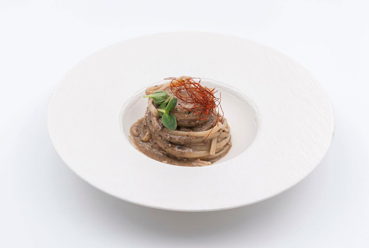 Liguine con pesto di olive e colatura di alici di Cetara Linguine with olive pesto and traditional anchovy colatura from Cetara